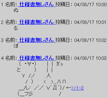3.面倒だからと謂って「>>1-1000」のように、一度に複数レスを叩くようなアンカーは言語道断。